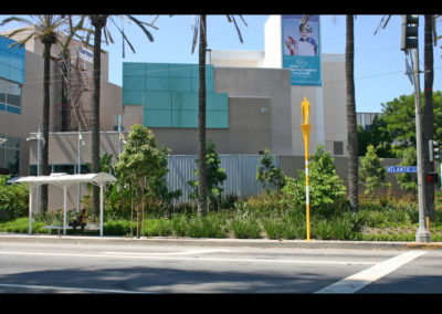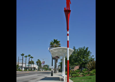 Artist Michael Davis designed three public transportation markers that are located in different locations along Atlantic Ave, Long Beach. The markers are distinguished by three colors: Red,Yellow & Blue. The artist designed the markers to be in silhouette to represent everyday commuters such as a parent and a child (blue) and businessmen (yellow & red) going to work or school. The civic art project was completed in 2011.