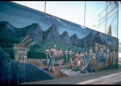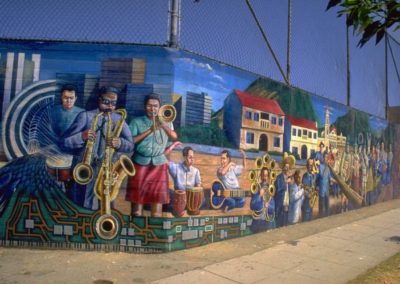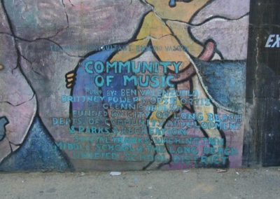 Located at George Washington middle school, artist Ben Valenzuela and assistants Brittany Powers, Opie Ortiz, Glen Sabalza painted ‘Community of Music’. The mural is painted in a life-like style and portrays different musical styles performed by people around the world. We can learn a lot from taking in the variety of instruments and cultures depicted. Community of Music portrays the importance of music for different cultures everywhere.