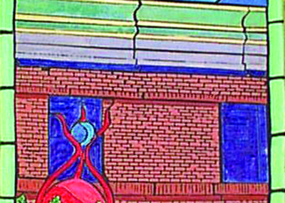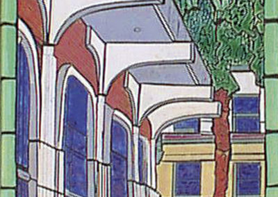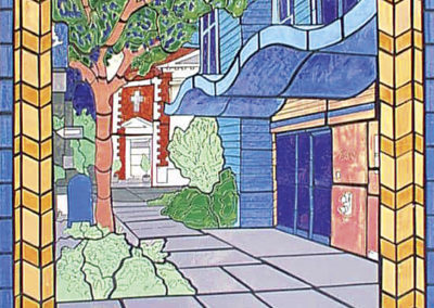 Terry Braunstein and Thomas Barter have enhanced the facades of the buildings on 1st Street to reflect the colorful Art Deco history of the East Village Arts District in Downtown Long Beach. Braunstein designed each vignette, which Barter, an East Village ceramist, rendered in hand-made tile. These colorful artworks also provide architectural detailing while framing the existing murals and bordering store doorways. Some of the geometric aspects of the designs create a three-dimensional effect and provide depth for the storefronts as well as for 1st Street. The large tile mural of a three-story Art Deco building on a corner mirrors the small-town atmosphere of Downtown combined with high-rises, important to the City’s commerce.