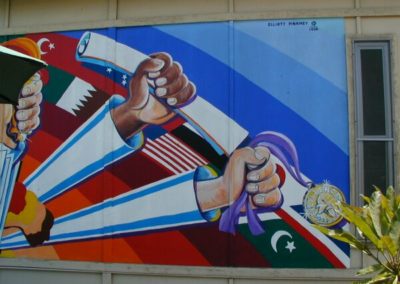 The vibrant mural by local artist Elliot Pinkney illustrates the wonders of education. The powerful message that education is universal is clearly depicted by the many flags of different countries and the different colored silhouetted images of children. Illustrated are fists rising in the air holding diplomas and a peaceful dove hovering over the composition suggesting world peace