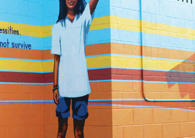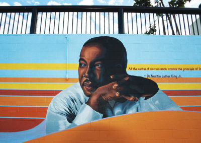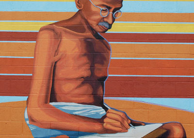 Peace Makers mural stands at 10′ high and 325′ long. The mural features portraits of 11 social and political activists promoting equality, peace and non-violence. They include: Mahatma Gandhi, Rosa Parks, Nelson Mandela, Robert F. Kennedy, Chuon Nath, César Chávez, Martin Luther King Jr., Mother Teresa, Dalai Lama, Dolores Huerta and Harvey Milk.