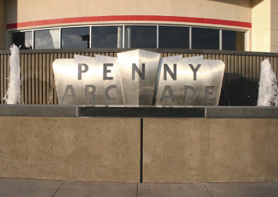 Four stainless steel sculptures, Plunge, Tattoo, Cyclone Racer, and Penny Arcade are sited within Rainbow Harbor Fountain at the Pike and tell the history of this location, which was an amusement park from 1915 until 1968. Historical photographic images from the Long Beach Historical Society are etched in black granite with didactic text along the wall of the fountain, which also serves as a seating area. Plunge pays tribute to Colonel Charles R. Drake’s Long Beach Bath House, a Romanesque building complete with a saltwater pool, which opened on July 4, 1902. The Plunge transformed the personal activity of swimming and bathing into a social activity. Tattoo acknowledges that, during WWll, Long Beach was the port of call for thousands of servicemen and women who found strength in the communal bond of service to their country. Lifelong friendships were forged with tattoos as indelible memories. Cyclone Racer is much like the development of the aircraft and the automobile in the early 20th century. The amusement devices created for the Pike were marvels of engineering, designed and built by visionaries pushing the limits of technology. Penny Arcade recognizes those who came to America with the clothes on their backs and the vision to start a new life in a land where anything was possible. For many, hard work and creativity transformed a dream into reality.