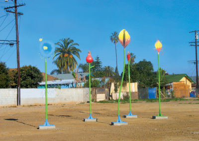 A collection of fourteen 7-foot-tall multicolored iron flowers are used to beautify the site, which was slated to be redeveloped into workforce housing by the City’s Long Beach Housing Development Company. Originally intended to be temporary.