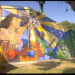 Unity – Village Pride with Sights High by Ricardo Mendoza depicts two central figures facing each other as they raise their clasped hands over their heads. Behind, rays of sunshine emanate from a radiant Earth lighting the mural with vibrant stripes. The image of Earth is at the center of multi-colored tree branches and leaves. The trunk is multicolored and the roots split off into red, blue, and green images of Earth. Smaller figures engage in activity on the central figures’ shirts. On the right side of the mural is a fantastical depiction of Earth as a playground with children playing on it